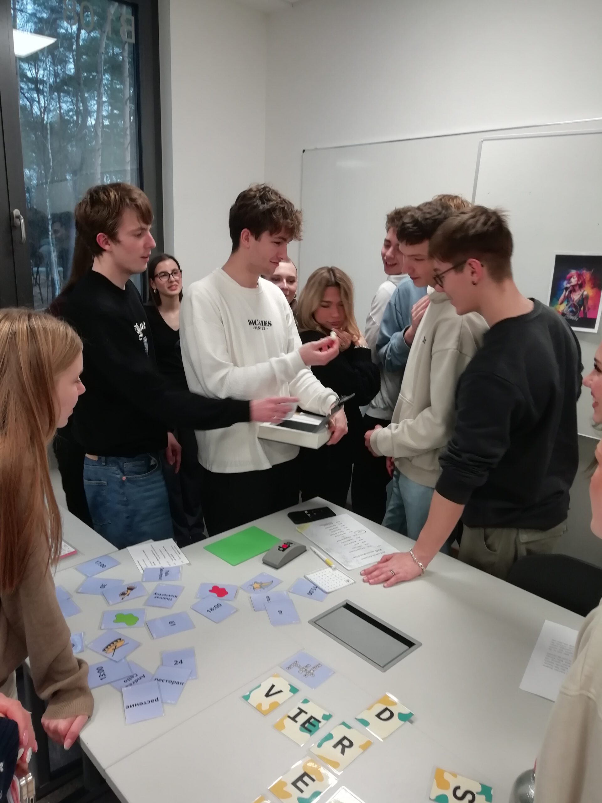 Wir arbeiteten in kleinen Gruppen und mussten innerhalb einer Stunde verschiedene Rätsel lösen und einen Code knacken. Einige Aufgaben waren auf Russisch, andere auf Deutsch gestellt, sodass wir viel miteinander sprachen und uns gegenseitig halfen. Mit einigen wenigen Tipps von Frau Koshkarova fanden wir die Ursache für den Zusammenbruch von Alex Dramski heraus: Erdnusspulver.