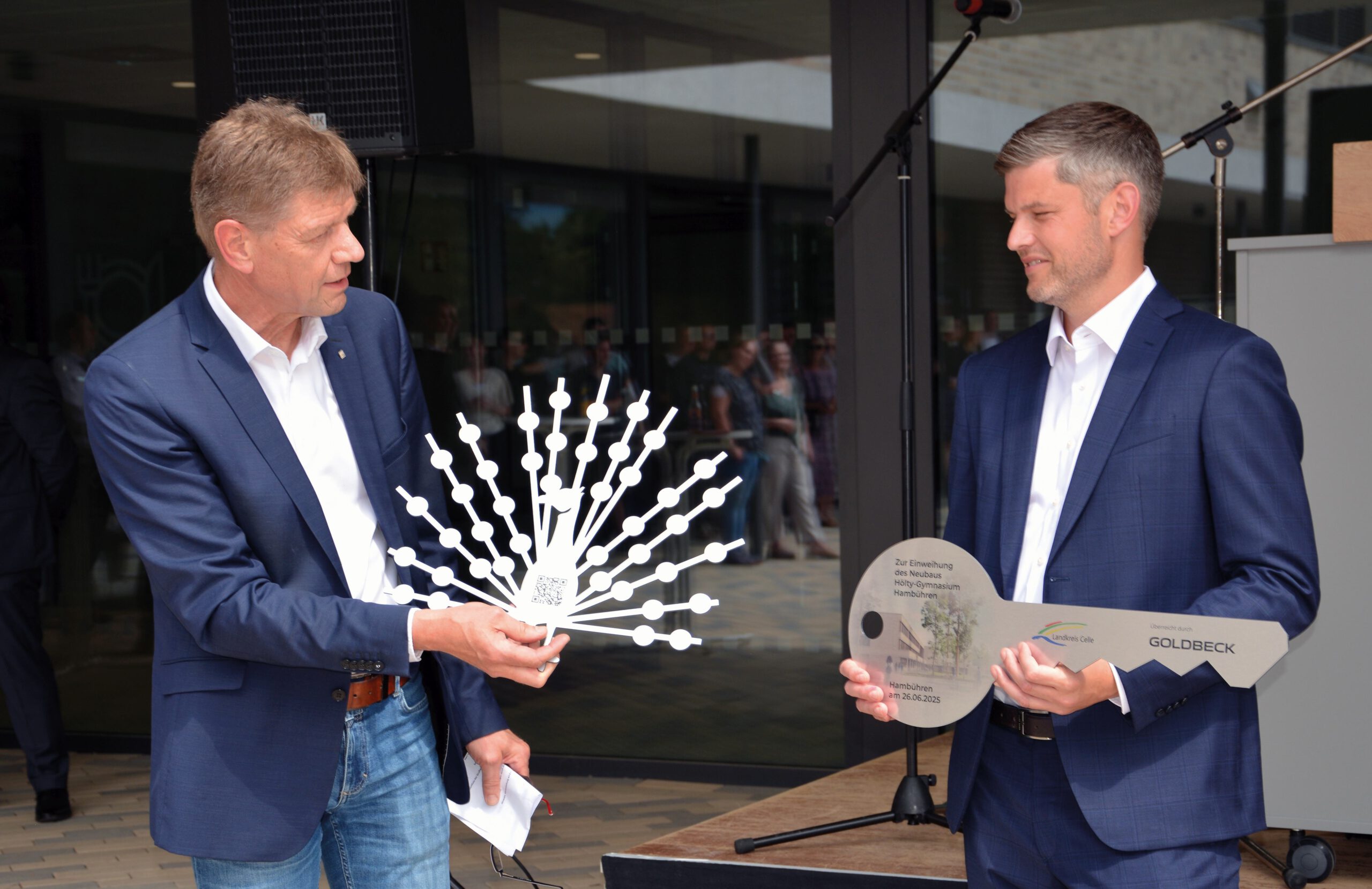 Siegfried Wendke von der Baufirma Goldbeck überreichte Schulleiter Stefan Lahme symbolisch den Schlüssel für das Gebäude und dazu noch einen metallenen Pfau mit QR-Code, der zu einem Video des Bauprozesses führt.