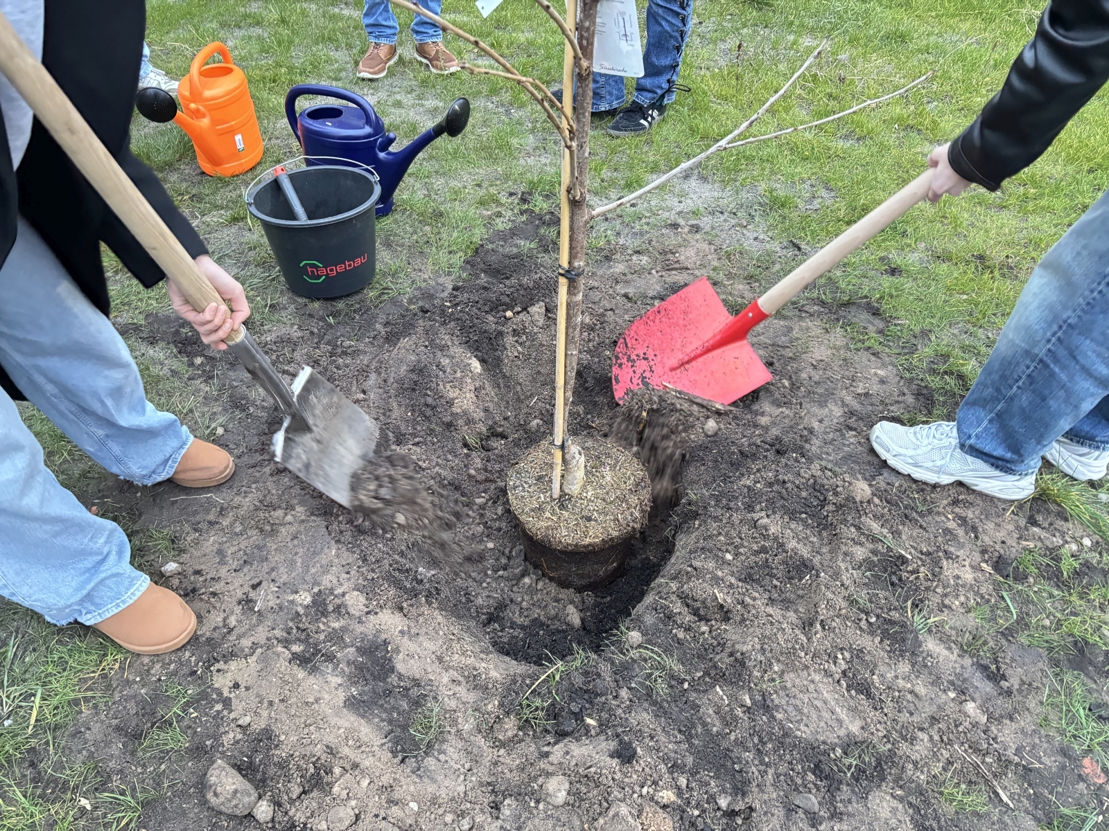 Wir trafen uns am Nachmittag des 19. Novembers, legten alles bereit und starteten mit dem Ausheben der Pflanzgruben. Die Arbeit an der frischen Luft und die gemeinsame Vorbereitung machten den Beginn der Aktion besonders. Unterstützt wurden wir außerdem von den Jahrgangssprechern des 13. Jahrgangs, die sich mit Einsatz an der Arbeit beteiligten und das Projekt damit tatkräftig unterstützten. Das Setzen der Bäume selbst war schließlich der Moment, auf den wir die ganze Zeit hingearbeitet hatten.