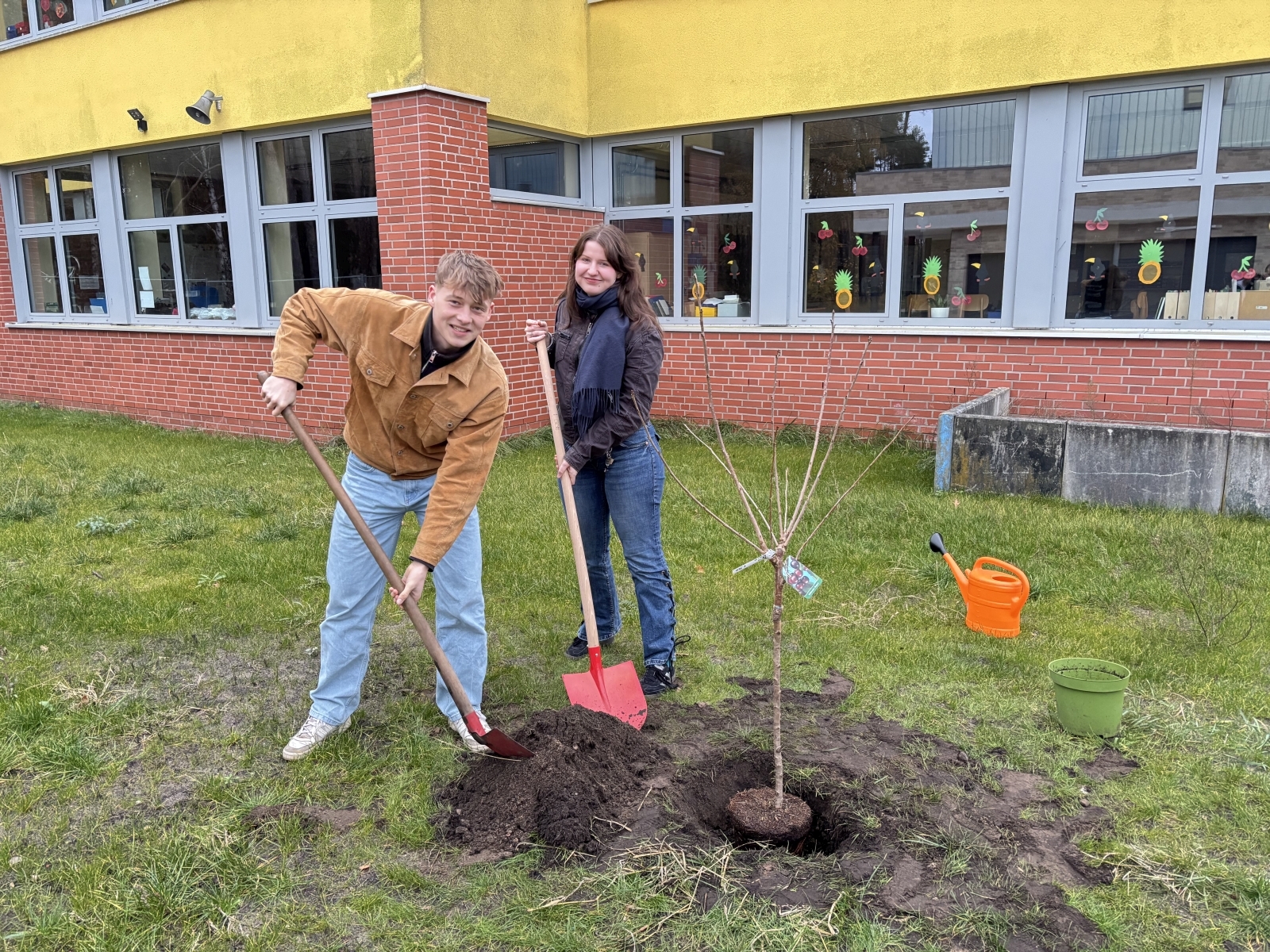 Als die jungen Bäume aufrecht im Boden standen und wir die Erde rundherum auffüllten, wurde uns bewusst, dass wir tatsächlich etwas geschaffen hatten, das dauerhaft sichtbar bleiben würde. Ein Projekt, das nicht nach dem Präsentationstag endet, sondern mit jedem Jahr mehr Gestalt annimmt. Die zwei Kirschbäume werden wachsen, blühen und vielleicht irgendwann ein fester Bestandteil unserer Schultradition sein – sei es als Foto-Hintergrund, schattiger Platz oder einfach als kleines Stück Natur mitten auf dem Schulgelände.