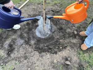 Wir trafen uns am Nachmittag des 19. Novembers, legten alles bereit und starteten mit dem Ausheben der Pflanzgruben. Die Arbeit an der frischen Luft und die gemeinsame Vorbereitung machten den Beginn der Aktion besonders. Unterstützt wurden wir außerdem von den Jahrgangssprechern des 13. Jahrgangs, die sich mit Einsatz an der Arbeit beteiligten und das Projekt damit tatkräftig unterstützten. Das Setzen der Bäume selbst war schließlich der Moment, auf den wir die ganze Zeit hingearbeitet hatten.