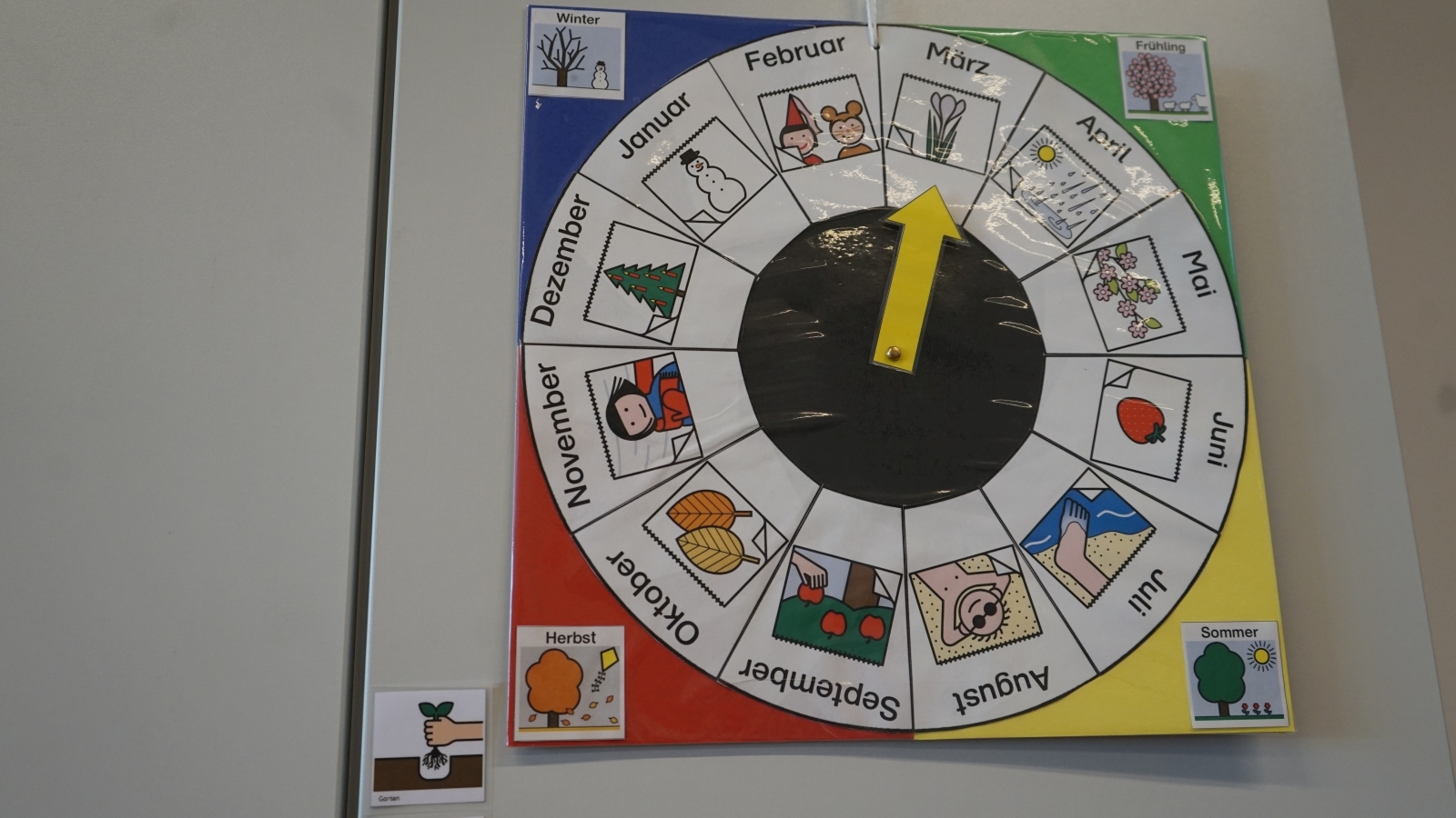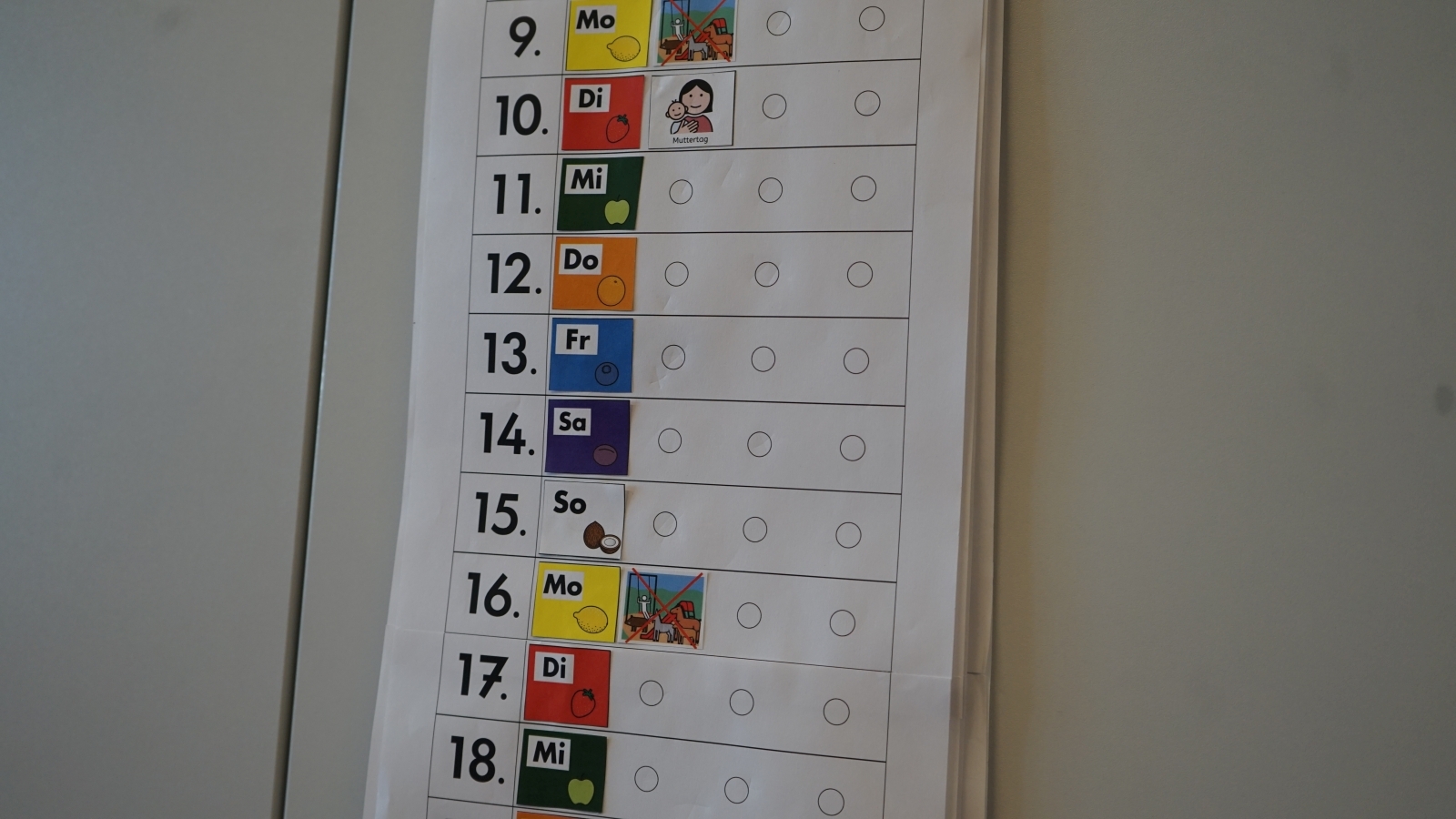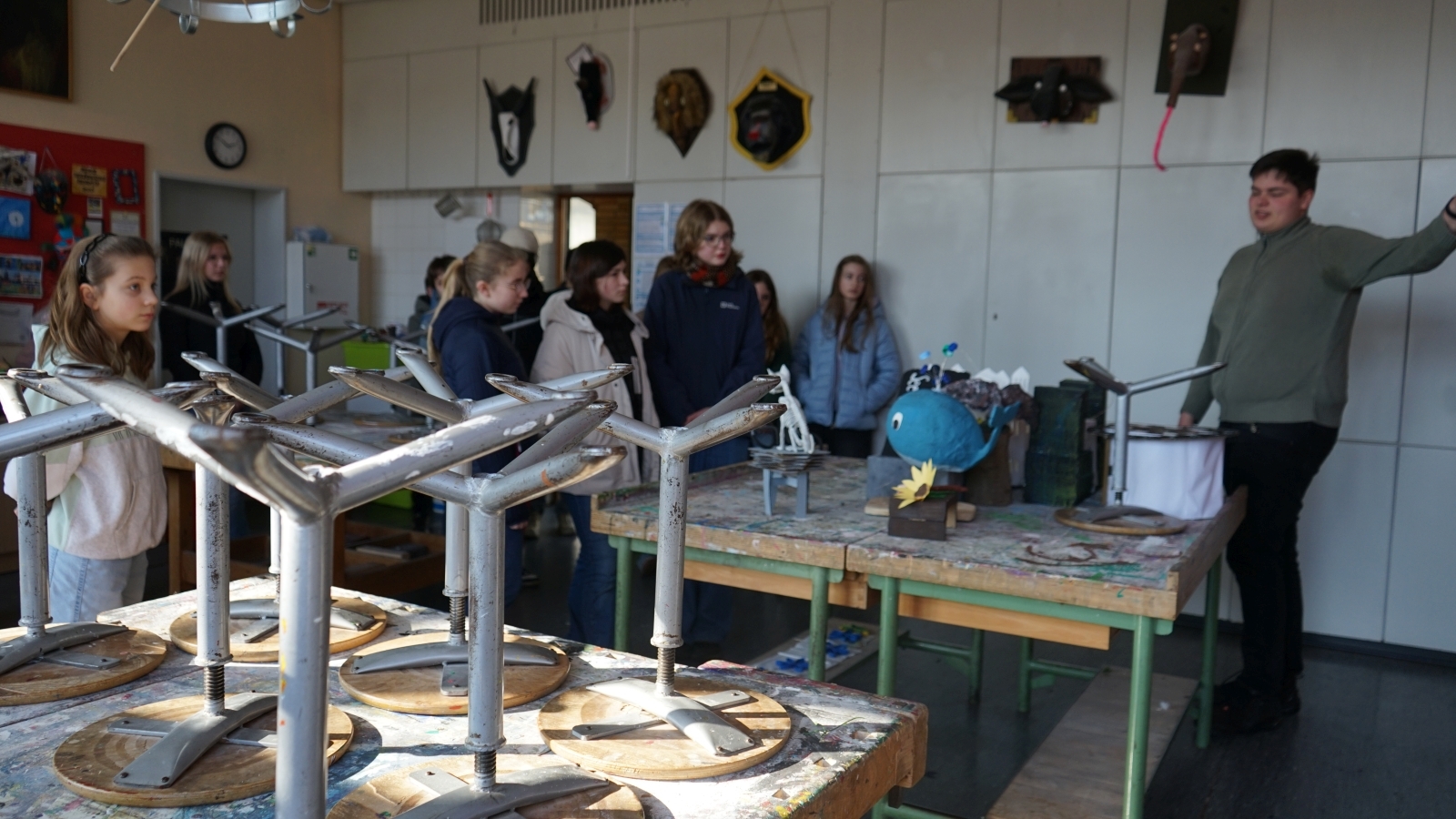 Nun haben sich die Kurse aufgeteilt und Lobetal besichtigt. Ein Teil der Tour war die Tagesförderstätte Emmaus, wo Personen mit geistiger Behinderung arbeiten und sich tagsüber beschäftigen. Nach einer kurzen Einführung haben die Kurse den Gruppenraum der orangenen Gruppe besucht. Dort wurde ihnen von einer Frau, die nicht lesen kann, durch Bilder vieles über den Raum und das Leben in Lobetal erzählt. Zum Beispiel hat sie von den Aufgaben, die die Bewohner haben, wie Kaffee kochen oder auch Post holen, erzählt, aber auch über die Alternativen zur Kommunikation, die die Personen haben, die nicht sprechen können, wie Gebärdensprache. Im Raum wurde alles beschriftet, aber nicht nur mit Buchstaben, sondern mit Bildern, so können auch Leute, die nicht lesen können, zeigen, was sie haben möchten.