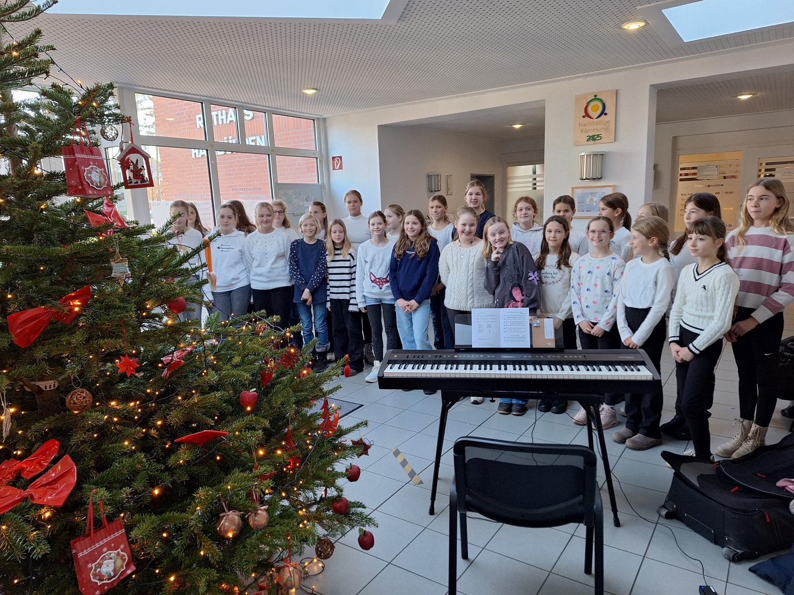 Am letzten Montag vor den Weihnachtsferien waren die Vokalini zu Gast im Rathaus. Dort sorgten sie mit einem kleinen Auftritt für festliche Stimmung bei Bürgermeister Herrn Kranz und den Mitarbeitenden. Der Unterstufenchor präsentierte Auszüge aus seinem Weihnachtsprogramm, und beim abschließenden Lied „O du fröhliche“ lud Chorleiterin Annika Weiß alle Anwesenden zum Mitsingen ein.