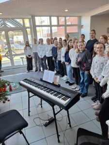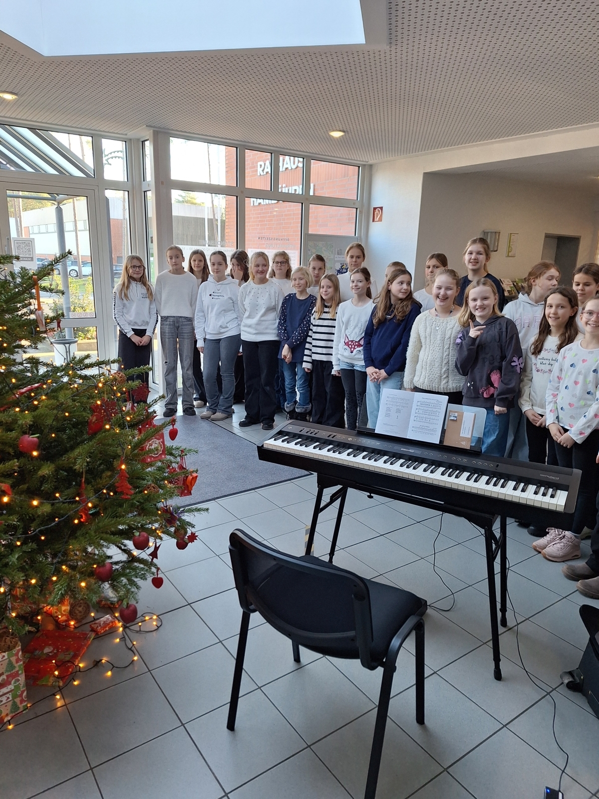 Am letzten Montag vor den Weihnachtsferien waren die Vokalini zu Gast im Rathaus. Dort sorgten sie mit einem kleinen Auftritt für festliche Stimmung bei Bürgermeister Herrn Kranz und den Mitarbeitenden. Der Unterstufenchor präsentierte Auszüge aus seinem Weihnachtsprogramm, und beim abschließenden Lied „O du fröhliche“ lud Chorleiterin Annika Weiß alle Anwesenden zum Mitsingen ein.
